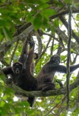 Grey-handed Night Monkeys peering out from behind a branch