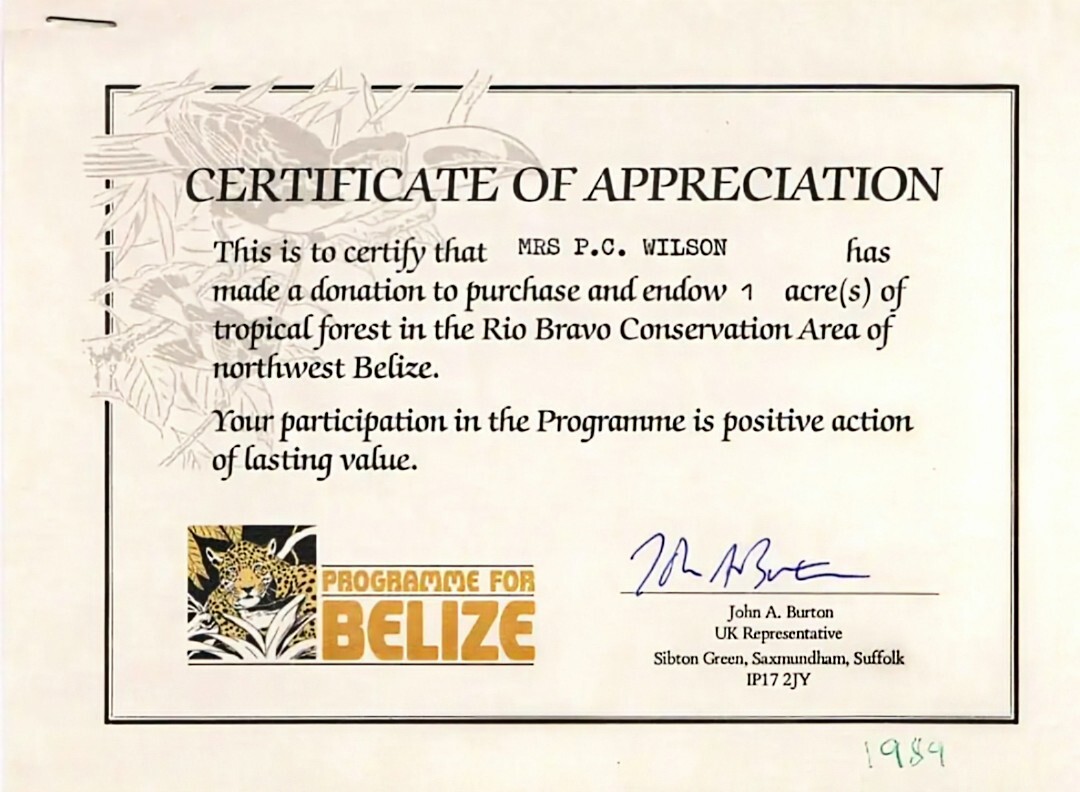 One of the first, if not the first, Buy an Acre certificates received by Hilary’s mother who was a steadfast supporter of Programme for Belize from the start. With many thanks to Hilary Hunt for providing this.
