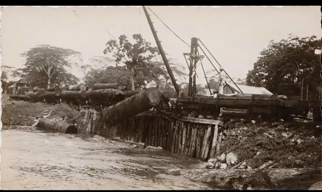 The Belize Estate and Produce Company’s (BEPC’s) purpose was to selectively log the forest surrounding Gallon Jug for commercially profitable hardwood trees. Once the trees were felled, the logs were carried in a log carriage pulled by a tractor and stockpiled for transport. They were then loaded onto the timber train and transported each day to the logging headquarters at Hill Bank. Here, the logs were offloaded into the lagoon, chained together, and towed by a tug for 97 km along New River to the sea at Chetumal Bay. From there, they were shipped a further 130 km along the coast to the sawmill in what is now Belize City. The great expense of transporting the logs this huge distance through the remote landscape was well worth it; such was the value of the timber.
