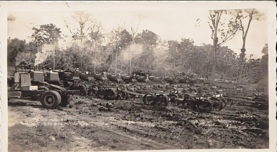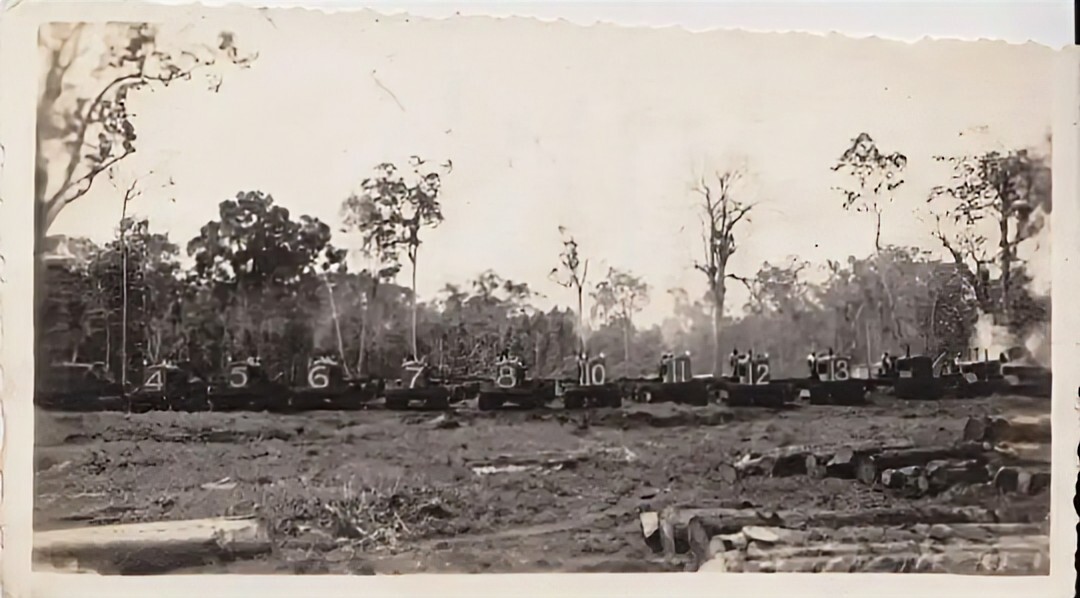 The tractors which were used to tow the logs from the point at which they were felled to the timber train. Of the 16 tractors pictured, one could count on around four being serviceable at any one time! Several were likely dragged into position for this eye-catching photograph, taken in the winter of 1945-1946.