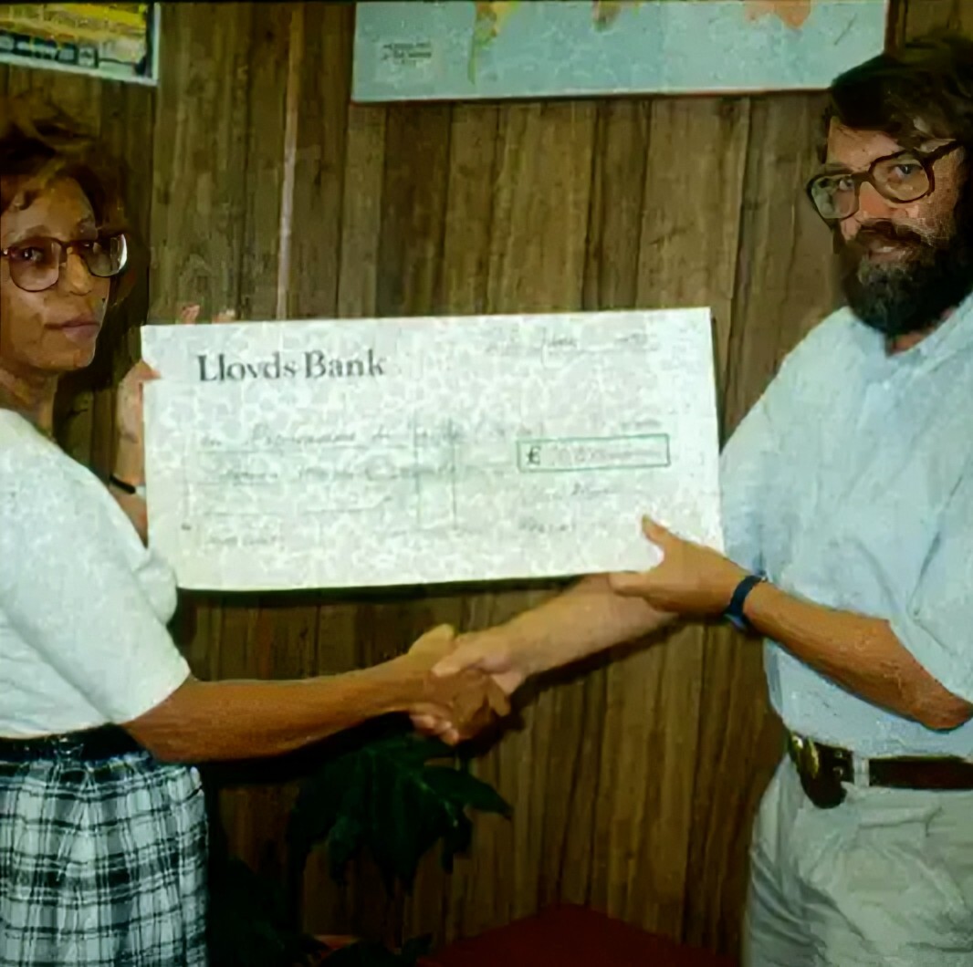 Joy Grant, PfB’s first executive director, and John Burton, co-founder of WLT, with a US$10,000 cheque to establish the UK-based charity Programme for Belize which would later become WLT.