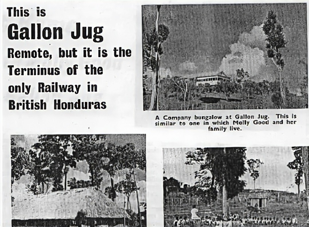 Located at the final stop of the timber railway, Gallon Jug was inhabited by a small community consisting of a superintendent, a mason, the foreman, engineers, foresters, and their families. Powered by a generator, the camp’s palm-roofed buildings included the workers’ accommodation, a school that doubled up as a church, a resthouse, police station, commissary (camp provision store), and dispensary (camp pharmacy). Beyond these were livestock pens, a vegetable garden, and a burial ground. While there, Hilary’s mother set up a library for families and children, lobbying the British Council to provide books, and even had a piano shipped to the camp. She also persuaded Belize’s orange producers to send oranges to Gallon Jug so the timber camp children had adequate vitamin C.