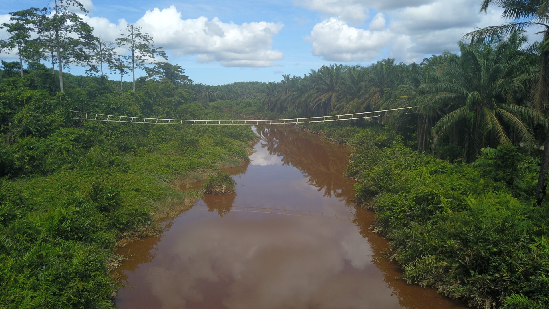 An artificial bridge over the Teneggang River in Sabah. This is one of many different designs trialled by HUTAN. Credit: HUTAN