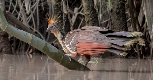 The Hoatzin (Opisthocomus hoazin) only eats plant material. For this, it has a specialised crop that allows foregut fermentation to take place. Credit: Judy Gallagher/iNaturalist