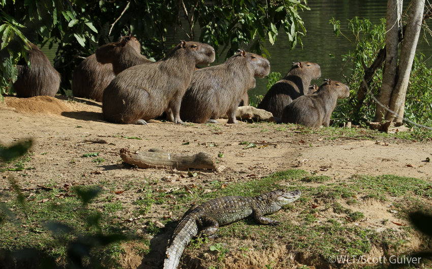A group of Capybara keeping a wary eye on a Broad-snouted Caiman in the wetlands of REGUA. Credit: ©WLT/Scott Guiver.