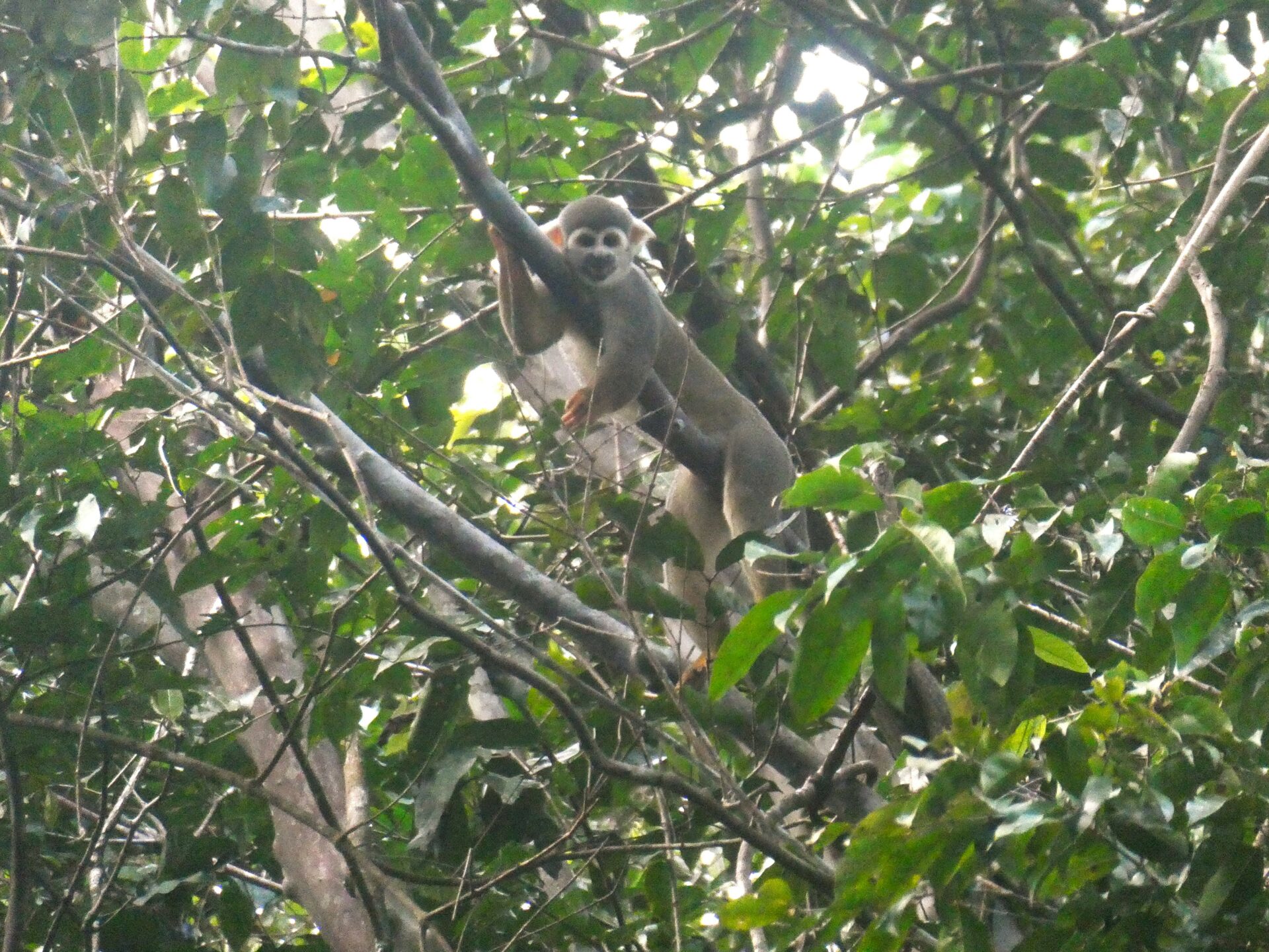 Away from human settlements where they are hunted for food or captured as pets, Marañón White-fronted Capuchins and their many friends, like this Black-capped Squirrel Monkey, can forage the forest floor, while their little ones perch in the trees. Credit: AMPA