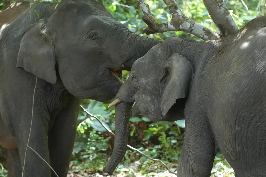 he behaviour of the Bornean Elephant is said to be much gentler and less aggressive than the mainland Asian Elephants, supporting the idea that they may be descended from a domesticated population. However, in the Lower Kinabatangan, in the state of Sabah, Malaysian Borneo, elephants are hostile towards any man-made objects within the forest. For example, traps set by the local community to catch smaller mammals are located and trampled by elephants and any part of a settlement that encroaches into their forest is in danger of destruction.