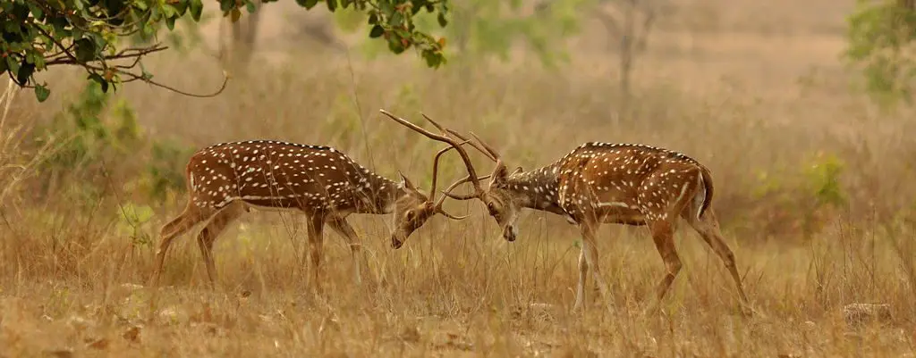 Chital are attractive spotted deer ranging from golden to rufous in colour. They are strongly sexually dimorphic: males are much larger than females and grow large, lyre-shaped antlers. They have white fur on their abdomen, rump, throat, ears and on the inner side of their tails.