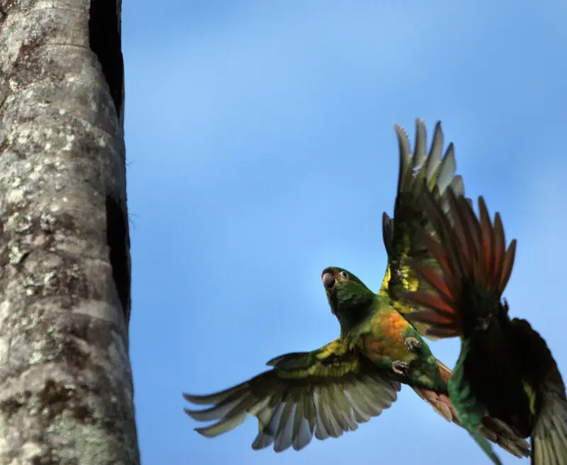 Habitat degradation and fragmentation are the two main threats causing a decline in the number of Golden-plumed Parakeets in Ecuador.