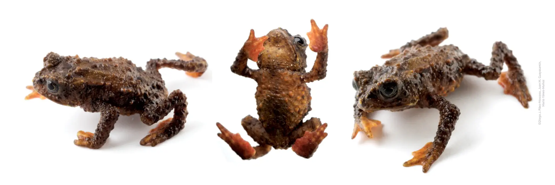 Osornophryne simpsoni is distinguished from other Osornophryne species by its short, rounded snout, the conical pustules on its flanks, and its fourth and fifth toes (which are longer than its other digits). The toad’s colouration is dark or light brown, with orange to yellow flanks, and a cream-yellow throat.