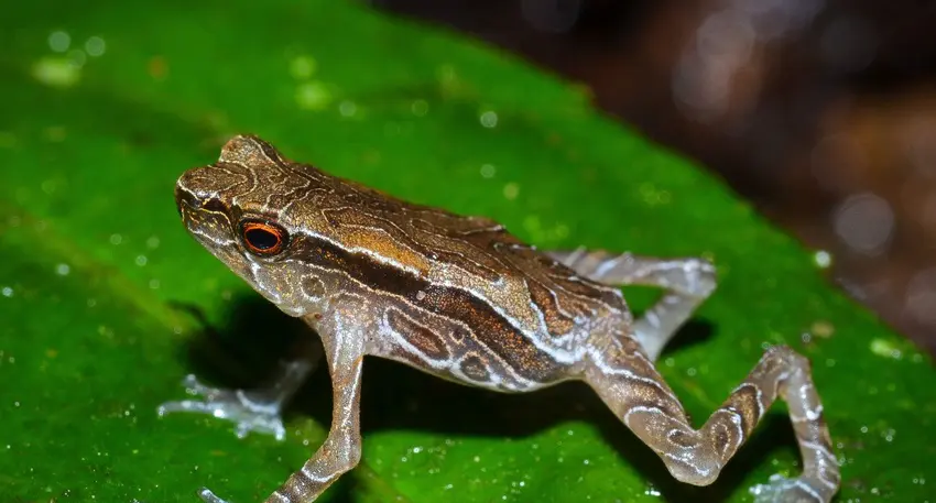 This tiny toad is dark brown in colour. Froglets show irregular white lines covering their bodies. It also shows a prominent red eye.