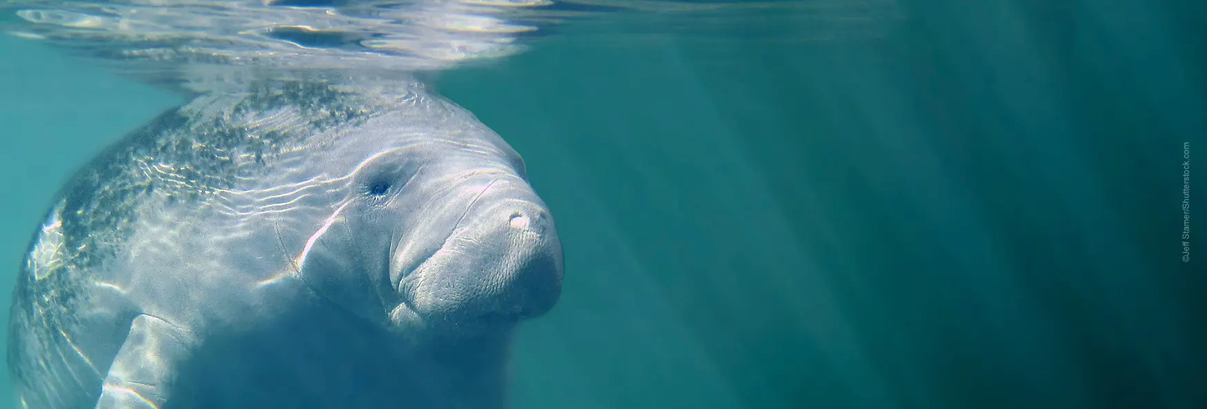 The West Indian Manatee, also known as the American Manatee, is one of three manatee species, the other two being Amazonian Manatee (T. inunguis) and West African Manatee (T. senegalensis). Manatees (often referred to as sea cows) are large, streamlined animals with round, barrel-shaped bodies and small heads; they can weigh up to half a ton and live more than fifty years. They have paddle shaped front flippers, a powerful tail and a large downward-pointing muzzle. West Indian Manatees are covered in hairs called vibrissae which helps them pick up vibrations in the water.