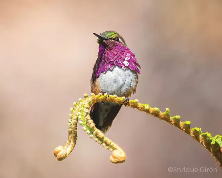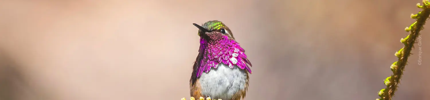 This tiny hummingbird measures at just 6.5-7cm long and weighs a mere 2.3-3.5 grams. Males have green upperparts and an expansive, glittering magenta-pink gorget with violet highlights. The flanks are a mix of cinnamon and green and the rest of the underparts are white. They have a rather short tail with a rusty-coloured base and white corners on the tail tips.